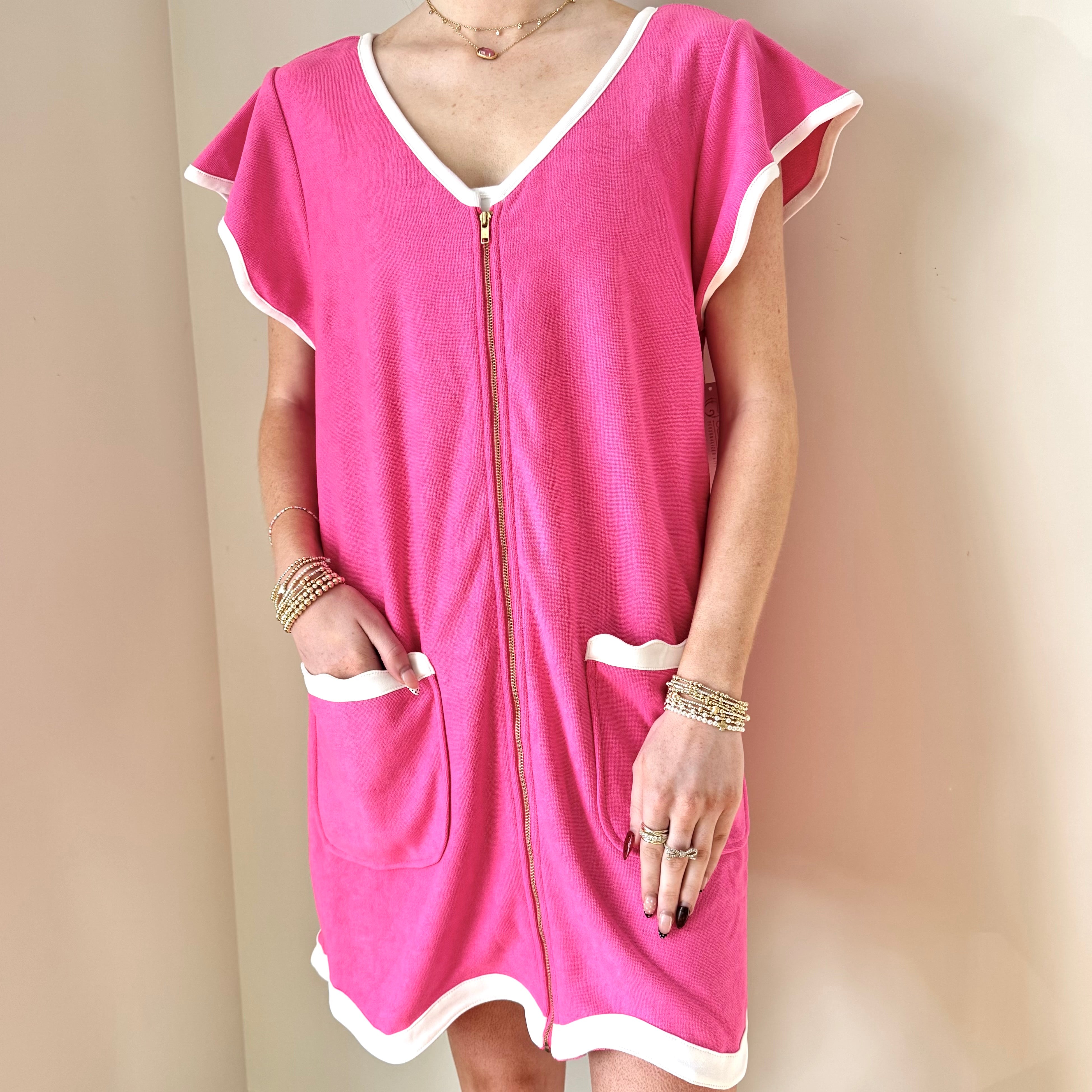 Our pink front-zip robe is as soft as it is stylish. Crafted from lightweight microfiber, it features short sleeves, a round collar, and crisp white trim for a classic, polished look. Perfect for lounging, getting ready, or gifting with a personal touch.