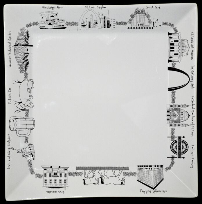 -White Porcelain Platter Featuring Black Illustrations of Infamous St. Louis Landmarks