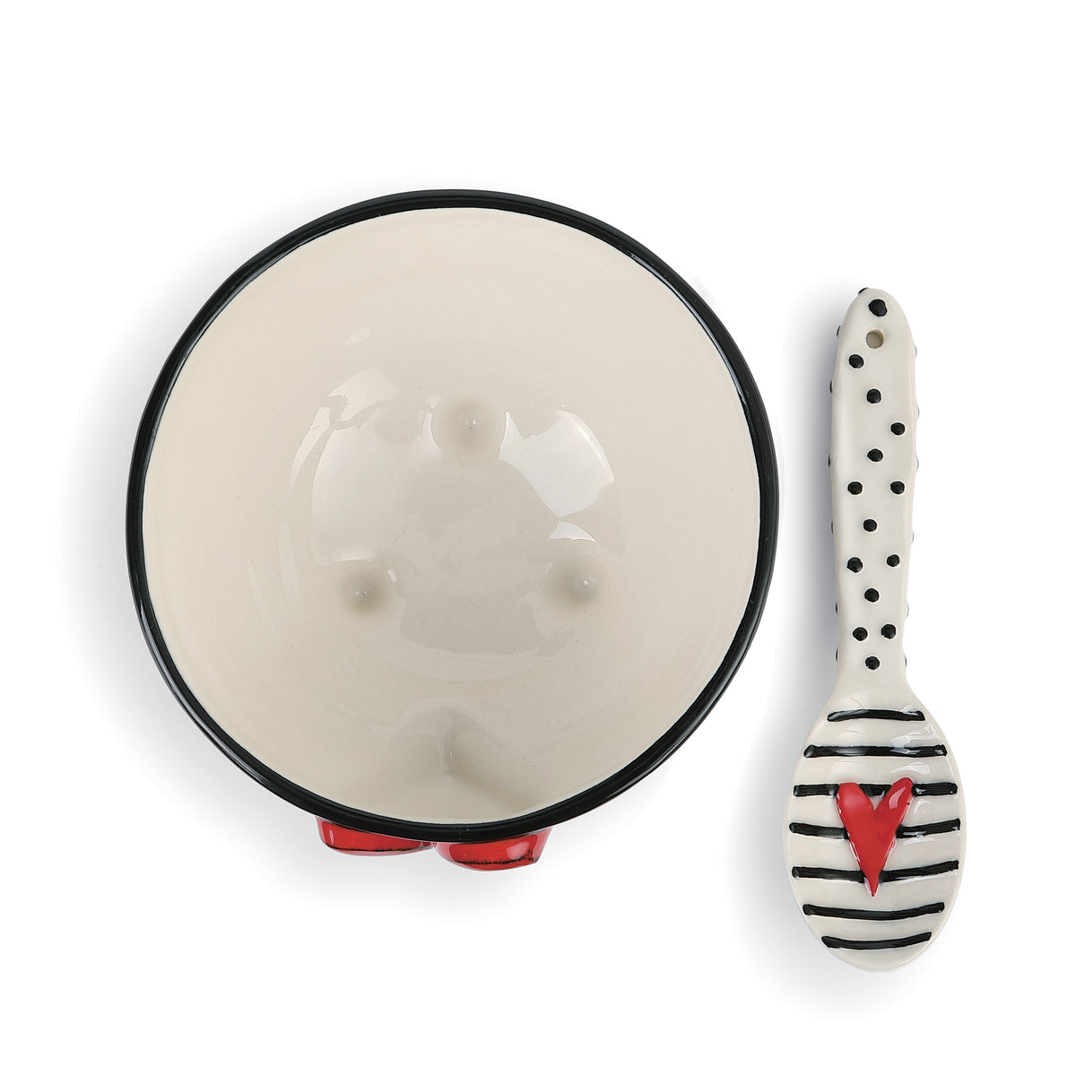-Set/2; 1 Round Stoneware Candy Bowl Featuring Wide Stripes & Vibrant Red Heart, 1 Matching Spoon