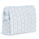 RIBBON FLORAL WHITE STRIPES WITH FLOWERS AND BLUE SCALLOP EDGESMONOGRAM EXTRARoadie is made with a thin Eco-friendly matte coating, an inside slip pocket and exterior snap open zip tabs for a wider opening and an easier access.MEDIUM Size: 9"l x 7.25"h x 3"dCoated CottonLined in poly twillChunky White Zipper with snap closure* Water and stain resistant & wipeable inside and out* Care: wipe with a clean damp cloth